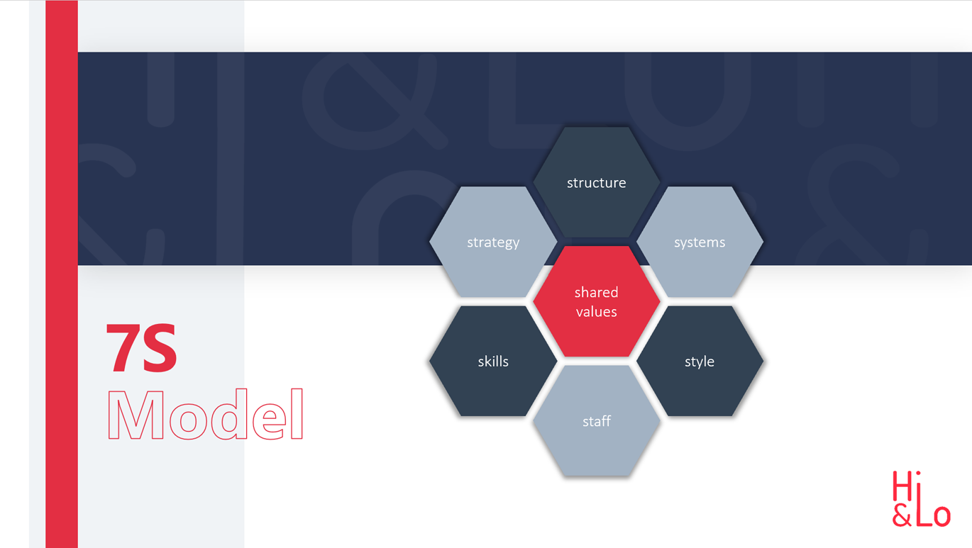 Das 7-S-Model wurde von der Unternehmensberatung McKinsey entwickelt und erläutert die Elemente, die ein Unternehmen beschreiben und erfolgreich machen. Es wird zwischen weichen und harten Faktoren unterschieden. Bei den harten Faktoren handelt es sich um Strategie, Struktur und Systeme, worum es bei den weichen Faktoren um Fähigkeiten, Personal, Stil und geteilte Werte geht. Ziel des 7-S-Modells ist es alle sieben Faktoren zu analysieren und einen Ist- und Soll-Zustand zu erarbeiten.